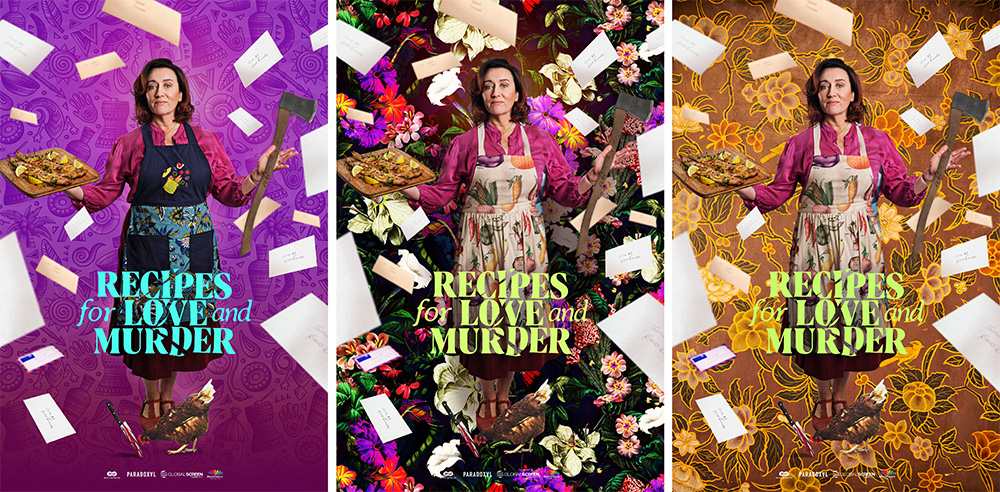 These went down well with the client, but – as is usually the case – they had a few notes. On reflection, they felt the image I’d used was too similar to the outfit and pose used on promo material for season one – so we ended up swapping the talent photography. They also wanted to lean more into the strong background pattern I’d used in the mood board, using it as a way to introduce a few elements from the show within it. All this led to the next pass of the design – for which I produced a range of quick options on different backgrounds, to see what would work best.
