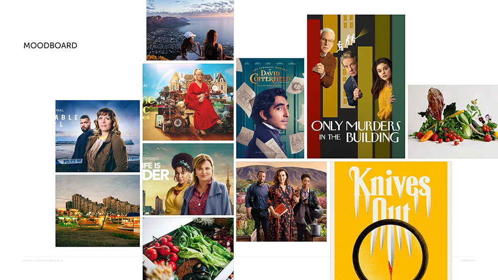 Once the general brief had been laid out the next step was to bring together a moodboard. This establishes a feel for the look and tone that we’d agreed we’d want the key art to channel. For Recipes for Love & Murder – this was bright, bold and eye-catching.